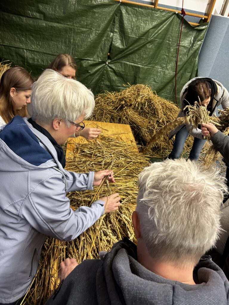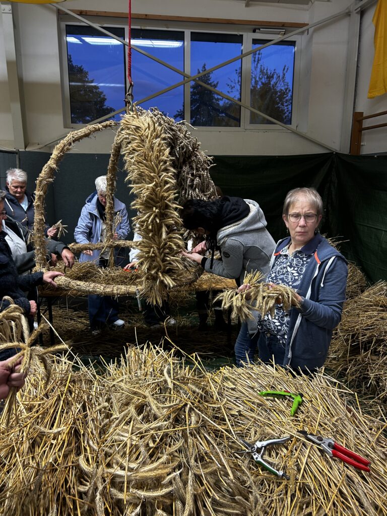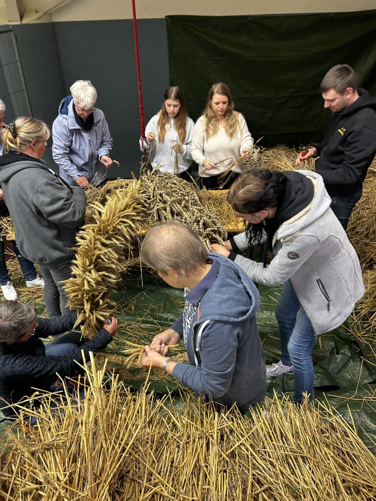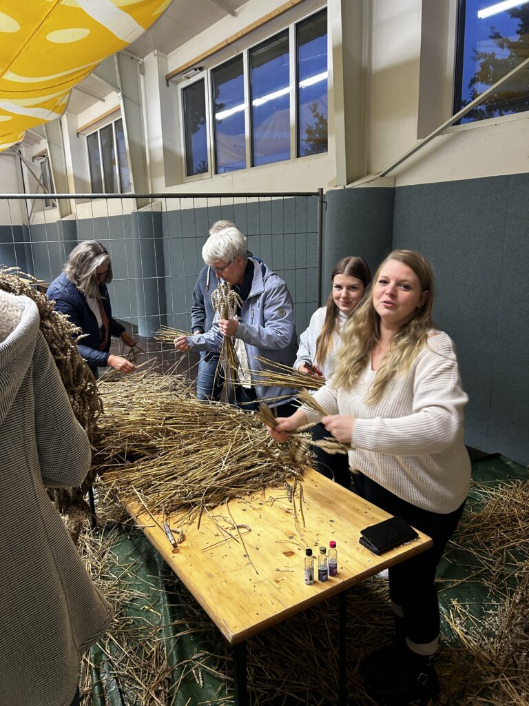 Am Freitag stand das traditionelle Erntekrone binden an. Rund 30 Leute kamen zusammen, um die schöne Krone zu binden. Bei netten Gesprächen, Kaltgetränken und ein bisschen Fingerfertigkeit wurde daraus ein richtig gemütlicher Abend.